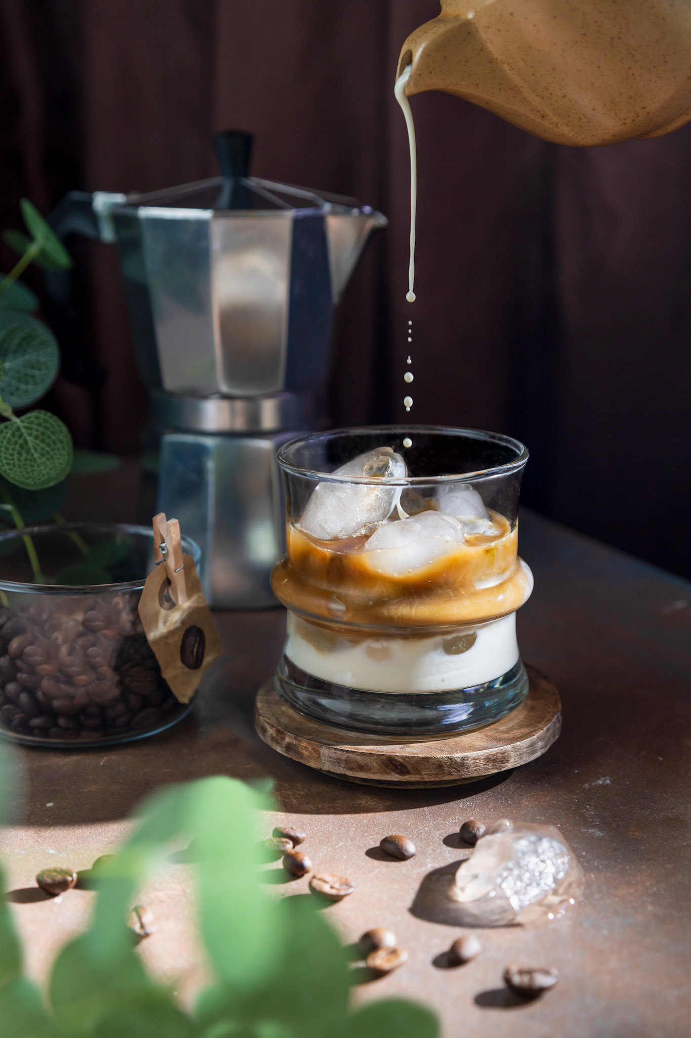 A glass double-sided cups of coffee with coffee in it on a wooden board on a grey background .