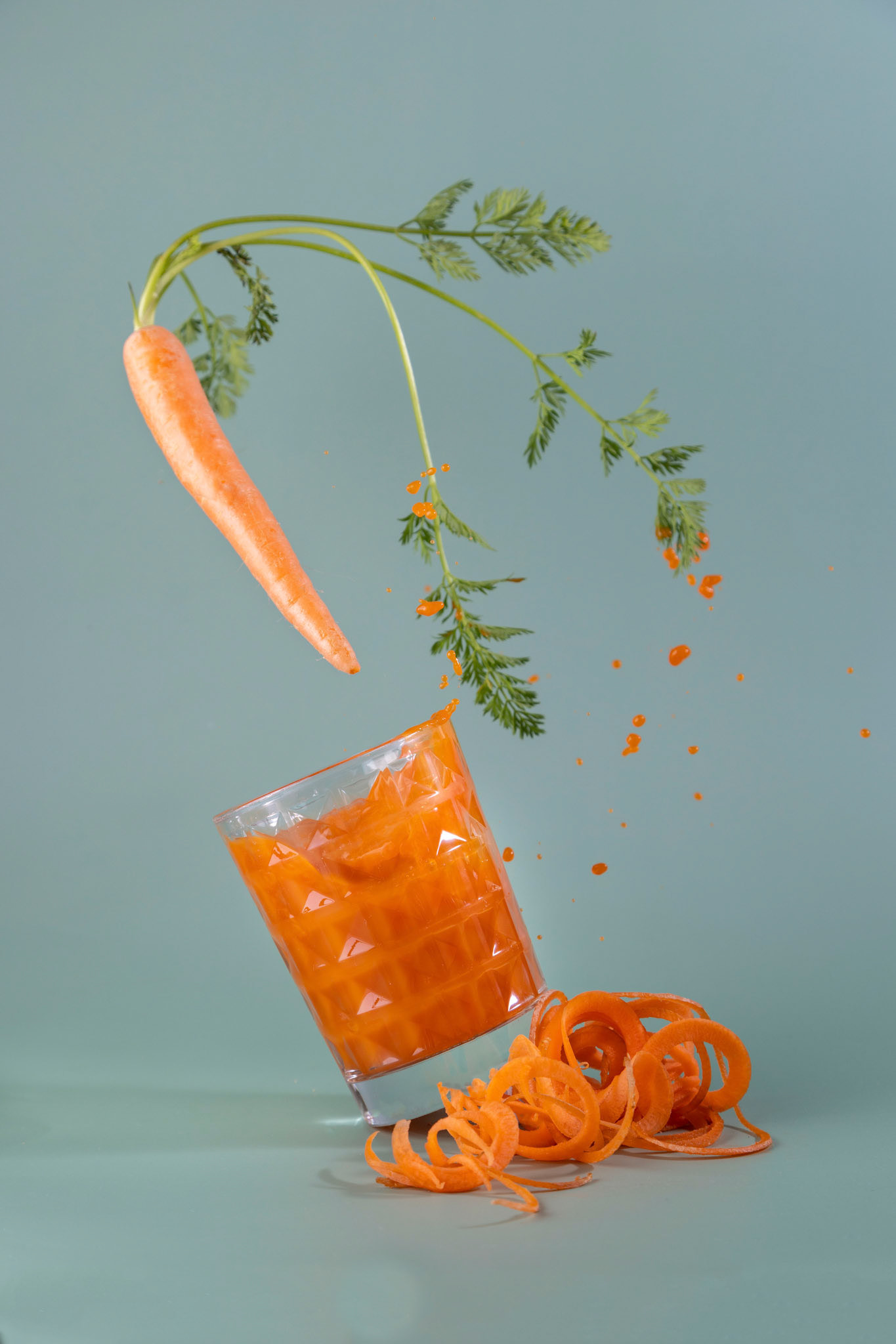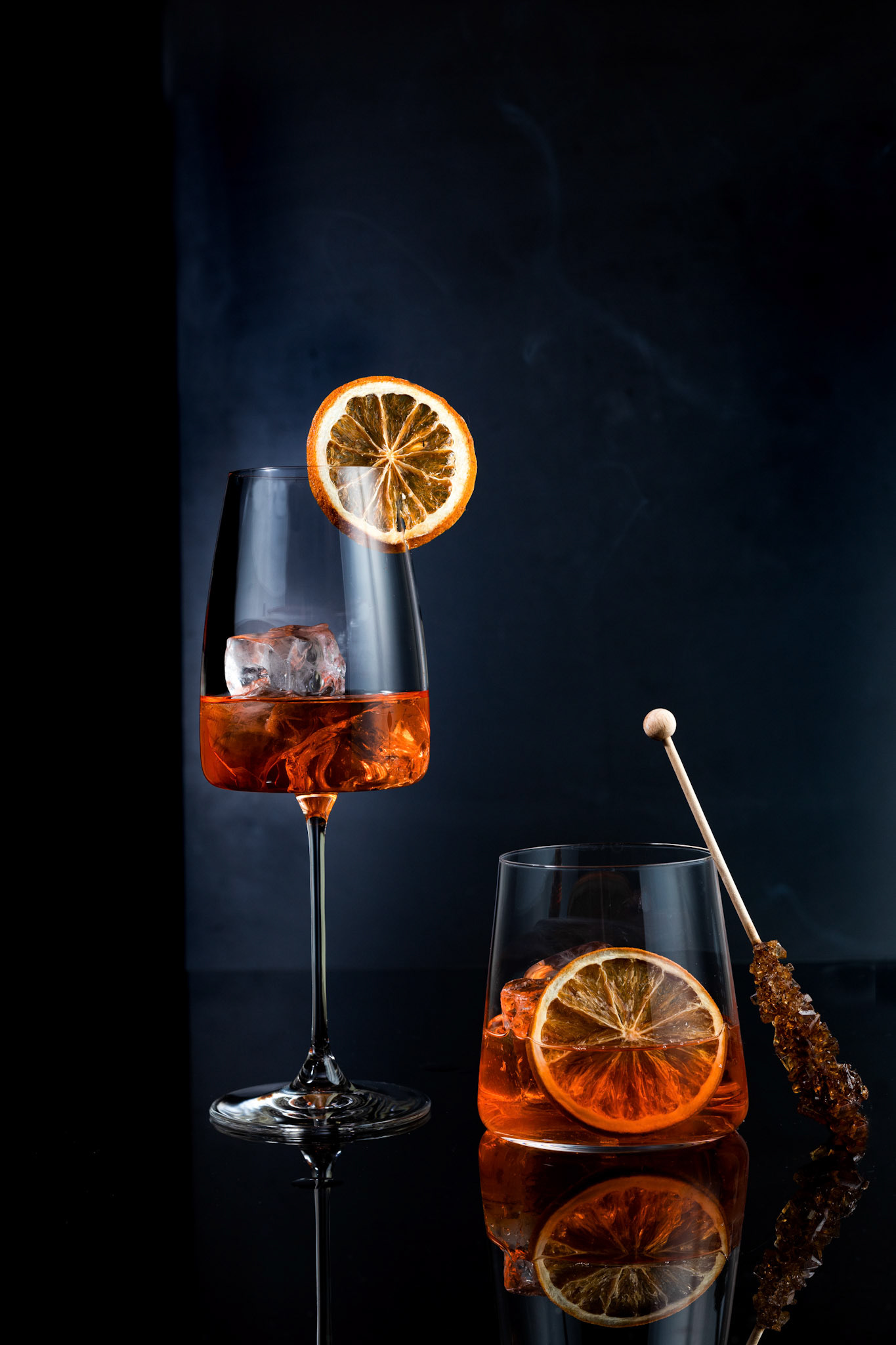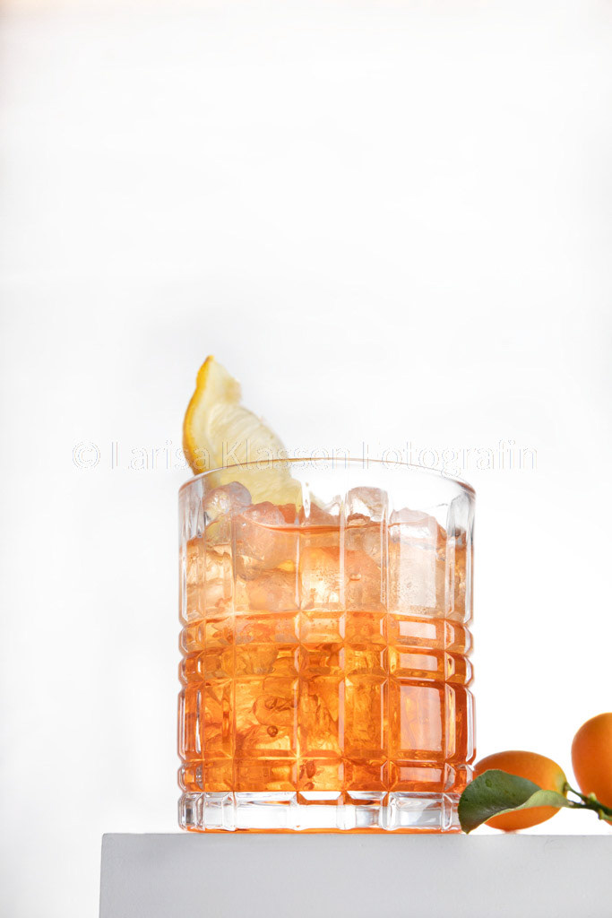 Glass of aperol spritz cocktail, with orange peel, photo with a balancing object on a green background .