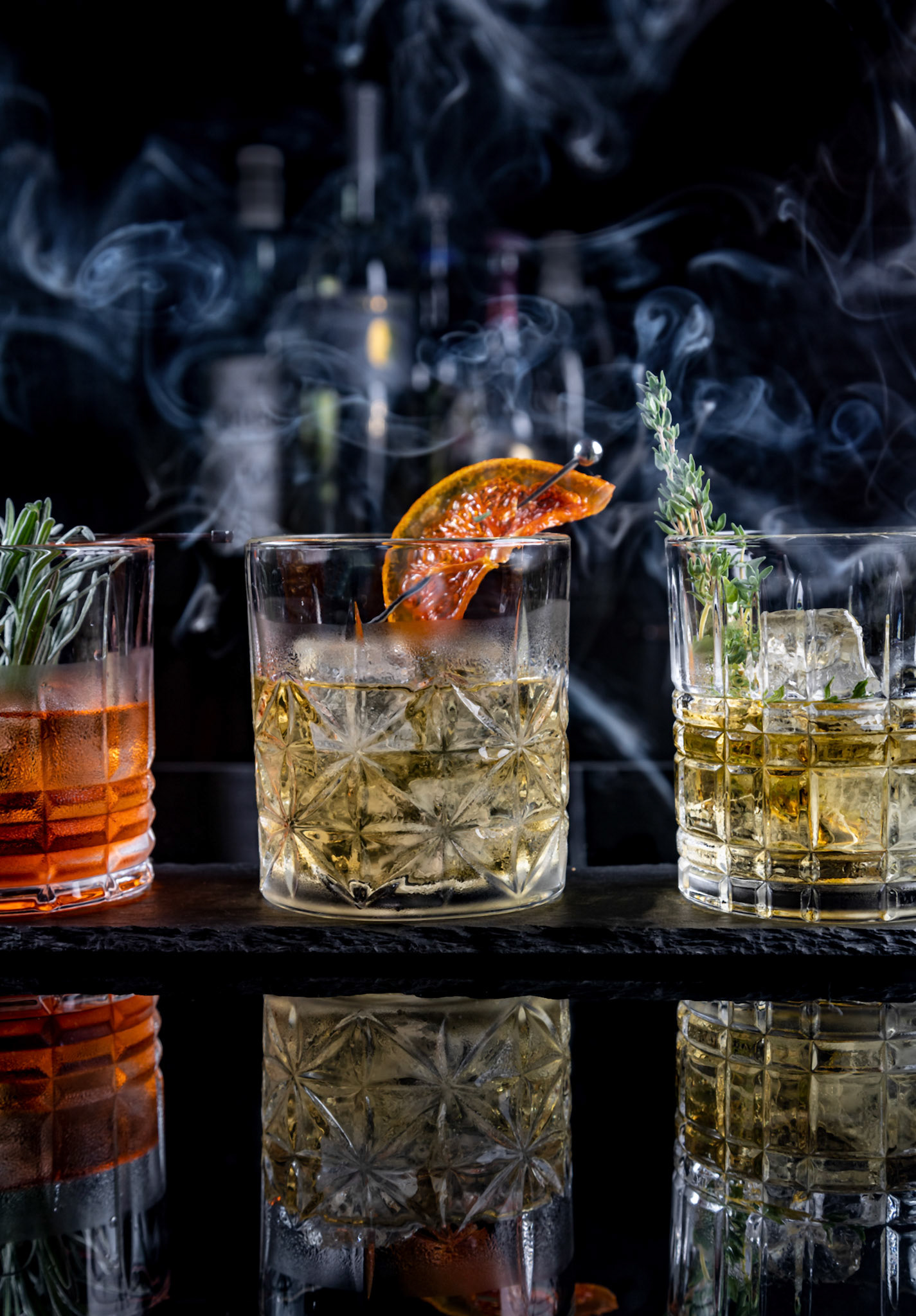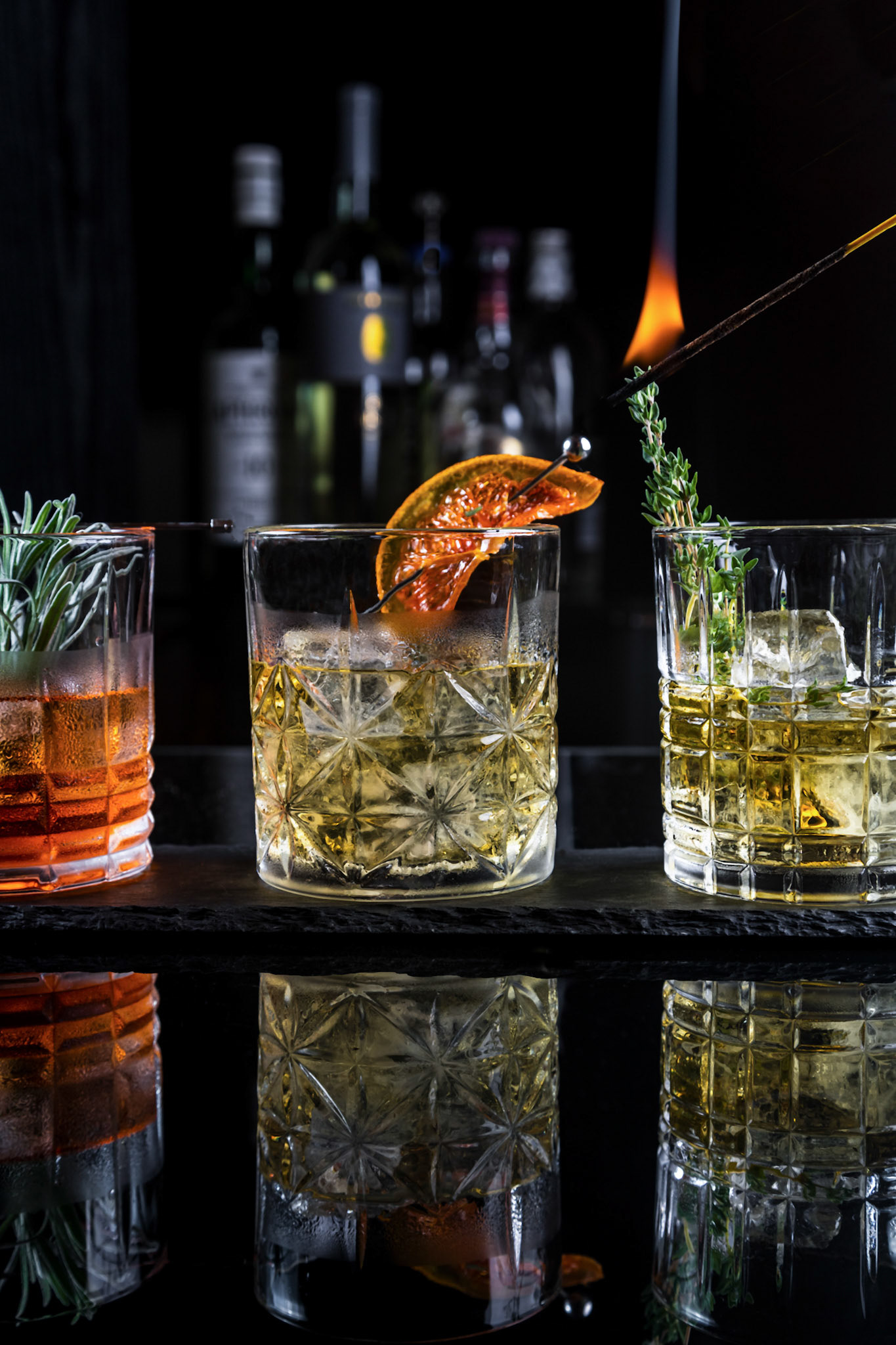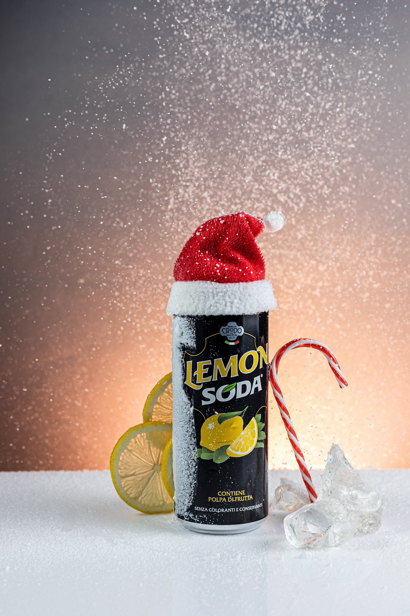 Glass of aperol spritz cocktail, with orange peel, photo with a balancing object on a green background .